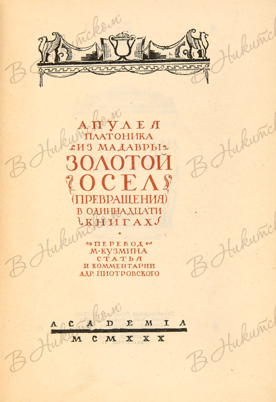 Апулей. Золотой осел / пер. М. Кузмина, статья и комментарии А. Пиотровского. [Л.]: «Academia», 1933.