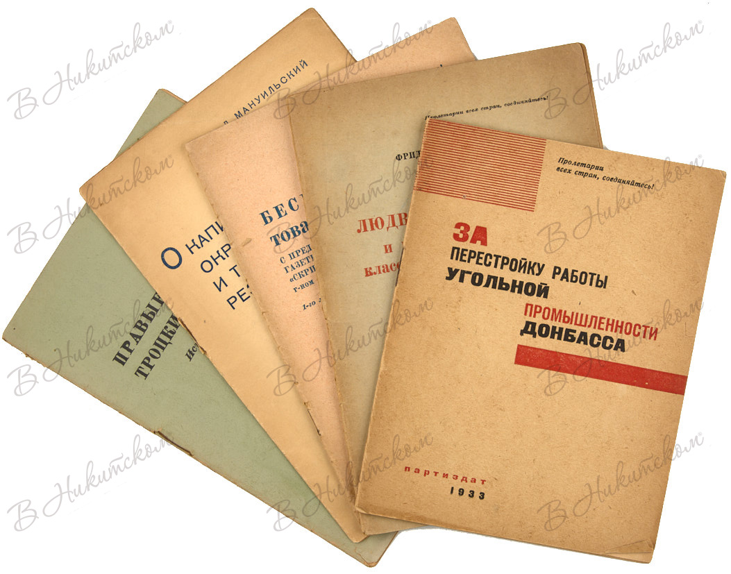 1. За перестройку работы угольной промышленности Донбасса. М.: ПАРТИЗДАТ, 1933. 31, [1] с. 17,3 х 13,2 см. В двухцветной издательской обложке. В очень хорошем состоянии.