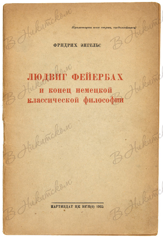 2. Энгельс, Ф. Людвиг Фейербах и конец немецкой классической философии. М.: ПАРТИЗДАТ, 1935. 63, [1] c. 19,3 х 13 см. В шрифтовой издательской двухцветной обложке. На оборотах обеих сторонок обложки, задней сторонке обложки и последней страницы владельческие записи простым карандашом.