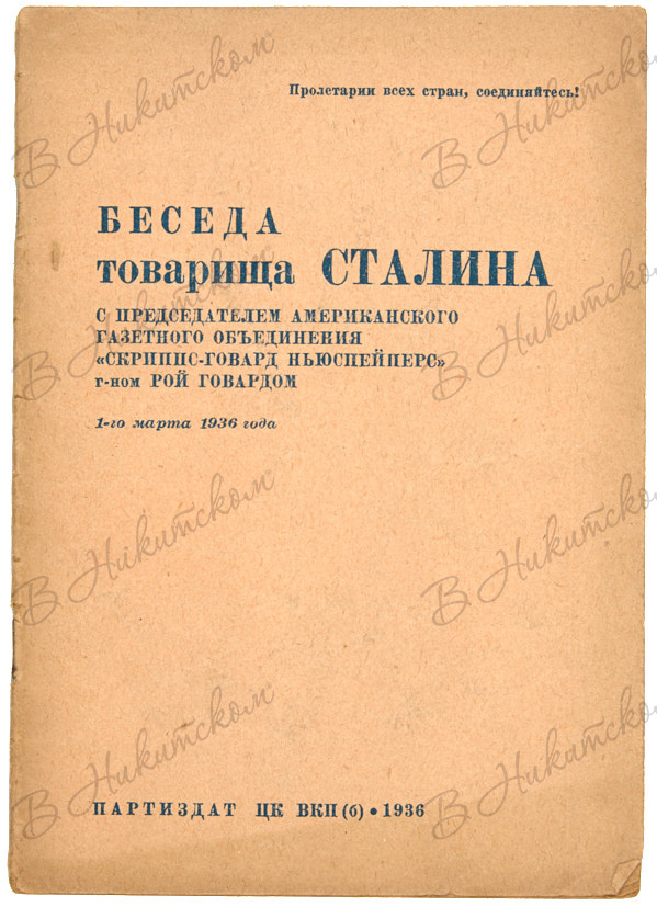 3. Беседа товарищ Сталина с председателем американского газетного объединения «Скриппс-Говард Ньюспейперс» г-ном Рой Говардом. М.: ПАРТИЗДАТ, 1936. 15, [1] с. 18,5 х 13 см. В шрифтовой издательской обложке. В хорошем состоянии.