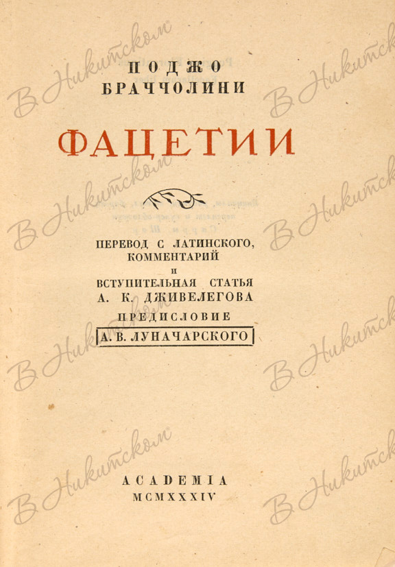 Браччолини, П. Фацетии / худ. С. Шор, пер. А.К. Дживелегова, пред. А.В. Луначарского. М.; Л.: Academia, 1934.