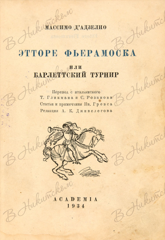 Д'Адзелио, М. Этторе Фьерамоска или Барлетский турнир / пер. с итал. Т. Гликмана и С. Розанова; статьи и прим. Ив. Гревса; ред. А.К. Дживелегова. М.; Л.: Academia, 1934.