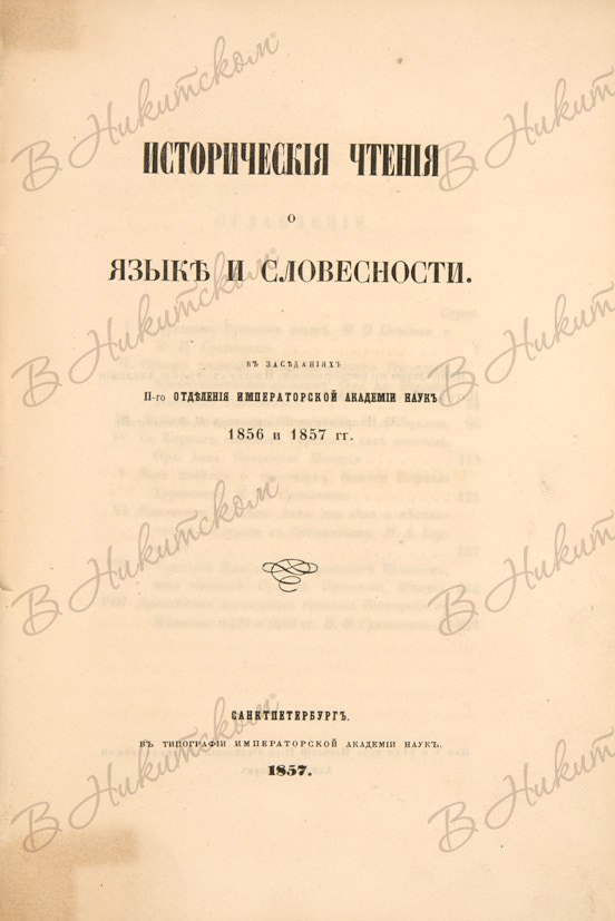 Исторические чтения о языке и словесности в заседаниях II-го Отделения Императорской Академии наук 1856 и 1857 гг. СПб.: В Тип. Имп. Акад. Наук, 1857.
