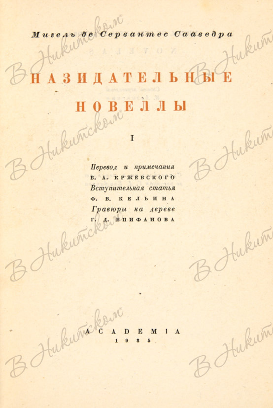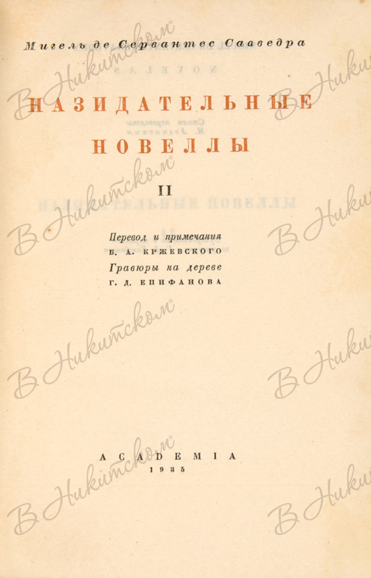 Сервантес Сааведра, М. Назидательные новеллы / пер. и прим. Б.А. Кржевского, вступ. ст. Ф.В. Кельша, гравюры на дереве Г.Д. Епифанова. [В 2 т.]. Т. 1-2. М.; Л.: Academia, 1934.