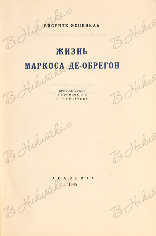 Эспинель, В.М. Жизнь Маркоса де-Обрегон / пер., статья и прим. С.С. Игнатова, оформ. В. Милашевского. М.; Л.: Academia, 1935.