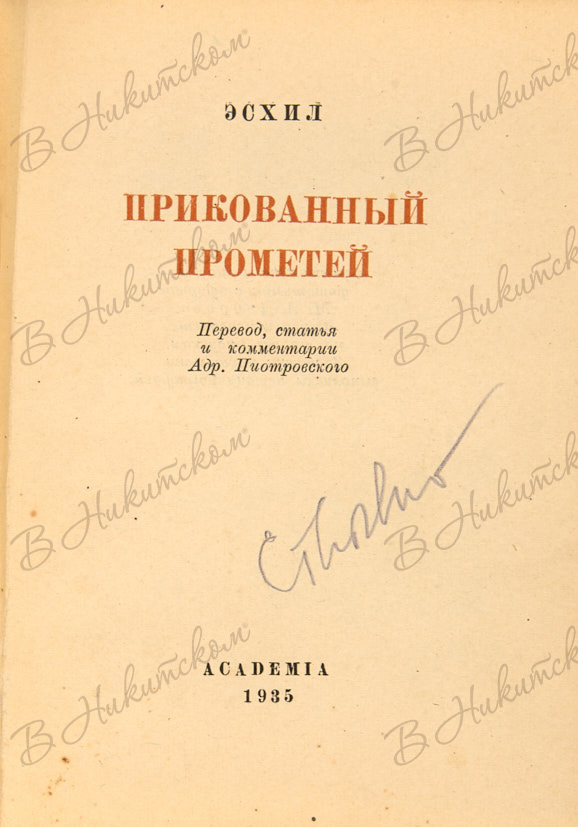 Эсхил. Прикованный Прометей / пер., статья и комм. Адр. Пиотровского. [М.]: Academia, 1935.