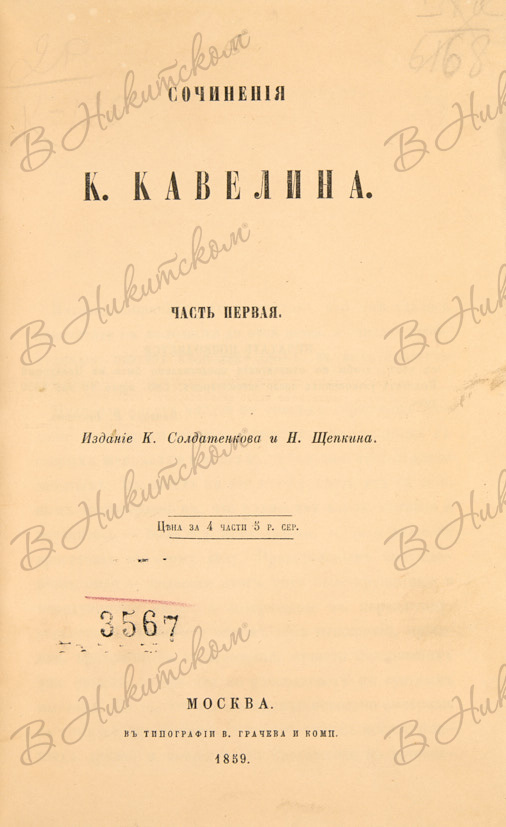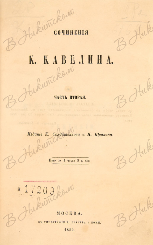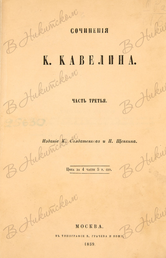 Кавелин, К.Д. Сочинения К. Кавелина. В 4 ч. Ч. 1-4. М.: Изд. К. Солдатенкова и Н. Щепкина, 1859.