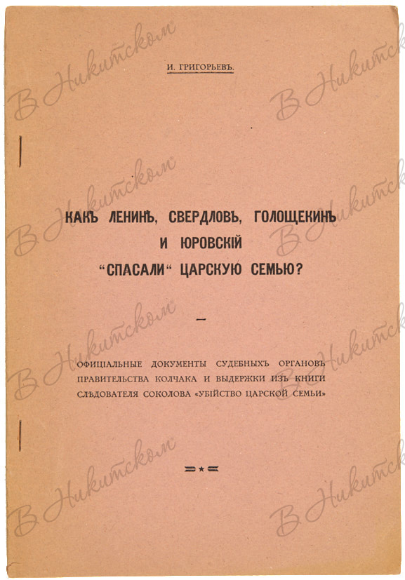 Григорьев, И. Как Ленин, Свердлов, Голощёкин и Юровский «спасали» царскую семью? / Официальные документы судебных органов правительства Колчака и выдержки из книги следователя Соколова и выдержки из книг следователя Соколова «Убийство царской семьи». [Париж, 1937].