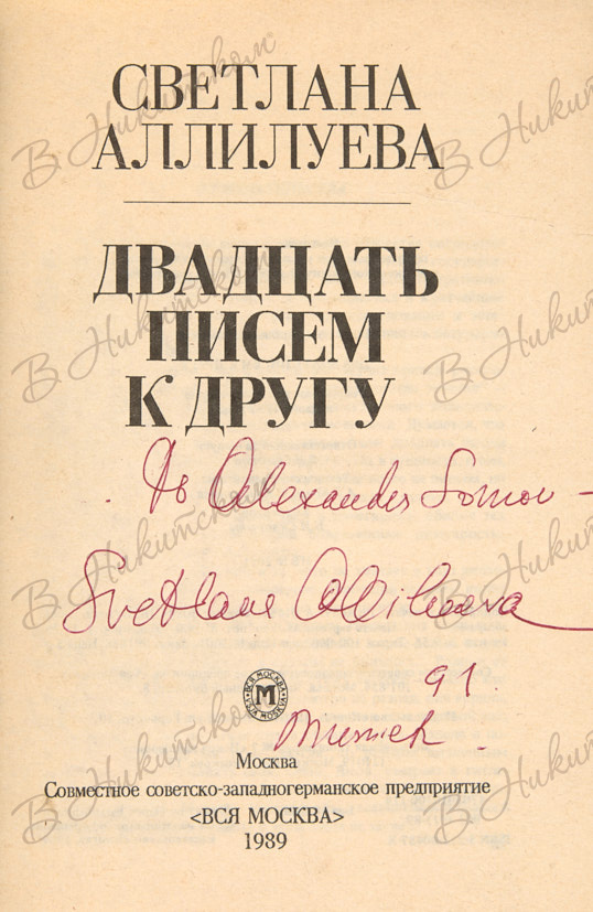 216 с. 19,8 х 14 см. В издательской обложке. В очень хорошем состоянии. На титульном листе автограф автора на английском языке: «To Alexander Somov - / Svetlana Allilueva / 91. / Munich.».