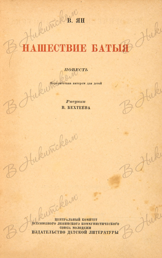 Ян, В. [Автограф]. Нашествие Батыя. М.; Л.: ДЕТИЗДАТ, 1941.