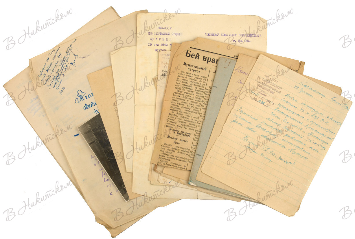В архиве тетрадь со списком личного состава ансамбля и благодарственные письма в адрес руководителя ансамбля от комиссаров, военкомов, политруков и начальников политоделов.