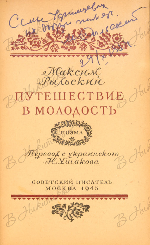 Рыльский, М. [Автограф]. Путешествие в молодость / перевод с укр. Н. Ушакова. М.: «Советский писатель», 1945.