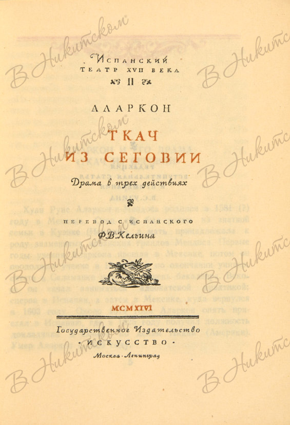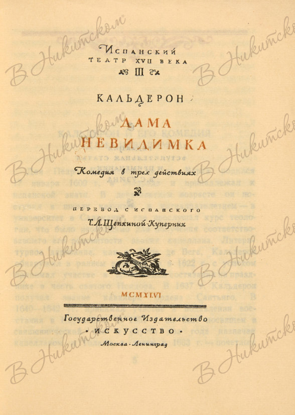 Испанский театр XVII века. 1. Лопе де Вега. Девушка с кувшином Аларкон. 2. Аларкон. Ткач из Сеговии. 3. Кальдерон. Дама невидимка. 4. Морето. За призрение презренье. В 4 ч. Ч. 1-4. М.; Л.: «Искусство», 1946.