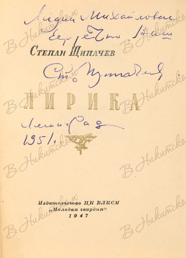 Щипачёв, С. [Автограф]. Лирика. М.: «Молодая гвардия», 1947.