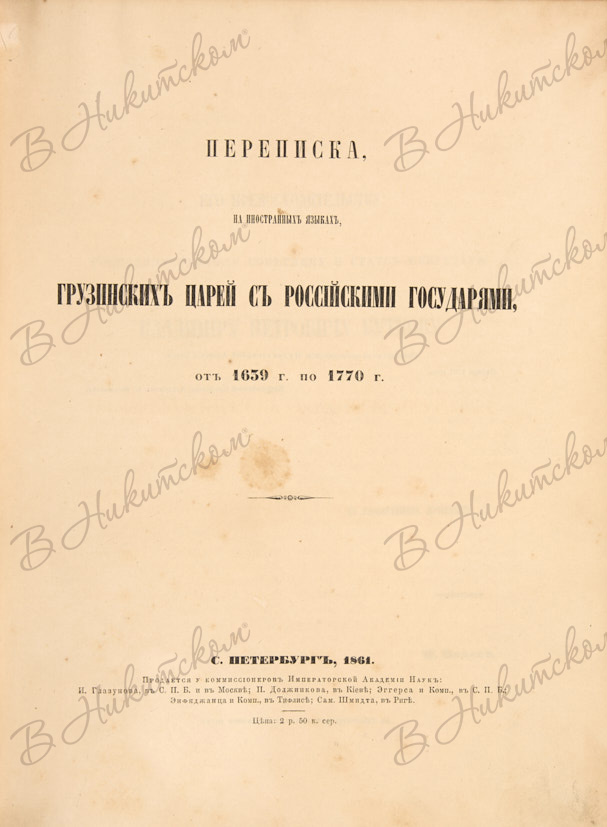 Переписка на иностранных языках грузинских царей с российскими государями от 1639 г. по 1770 г. СПб.: [Тип. Имп. Академии наук], 1861.