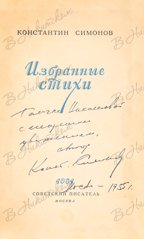 Симонов, К. [Автограф]. Избранные стихи. М.: «Советский писатель», 1951.