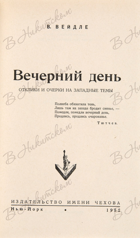 Вейдле, В. Вечерний день. Нью-Йорк: Издательство имени Чехова, 1952.
