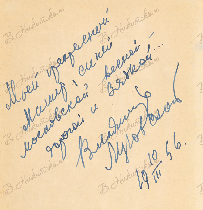 270, [2] с. 20,7 х 13,4 см. В коленкоровом издательском переплете с золотым тиснением. В очень хорошем состоянии. На форзаце 1а автограф автора: «Моей прекрасной / Машер, синей / московской весной, - / дорогой и вязкой... / Владимир Луговской / 1956 10/III».
