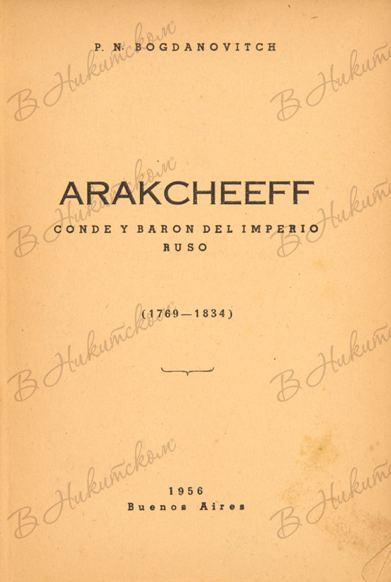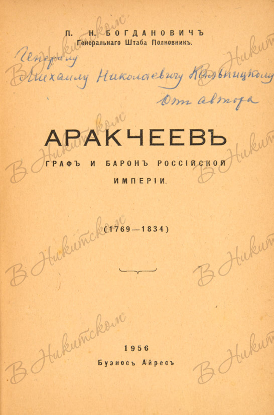 Богданович, П.Н. [Автограф генерал-лейтенанту М.Н. Кальницкому]. Аракчеев. Буэнос-Айрес, 1956.