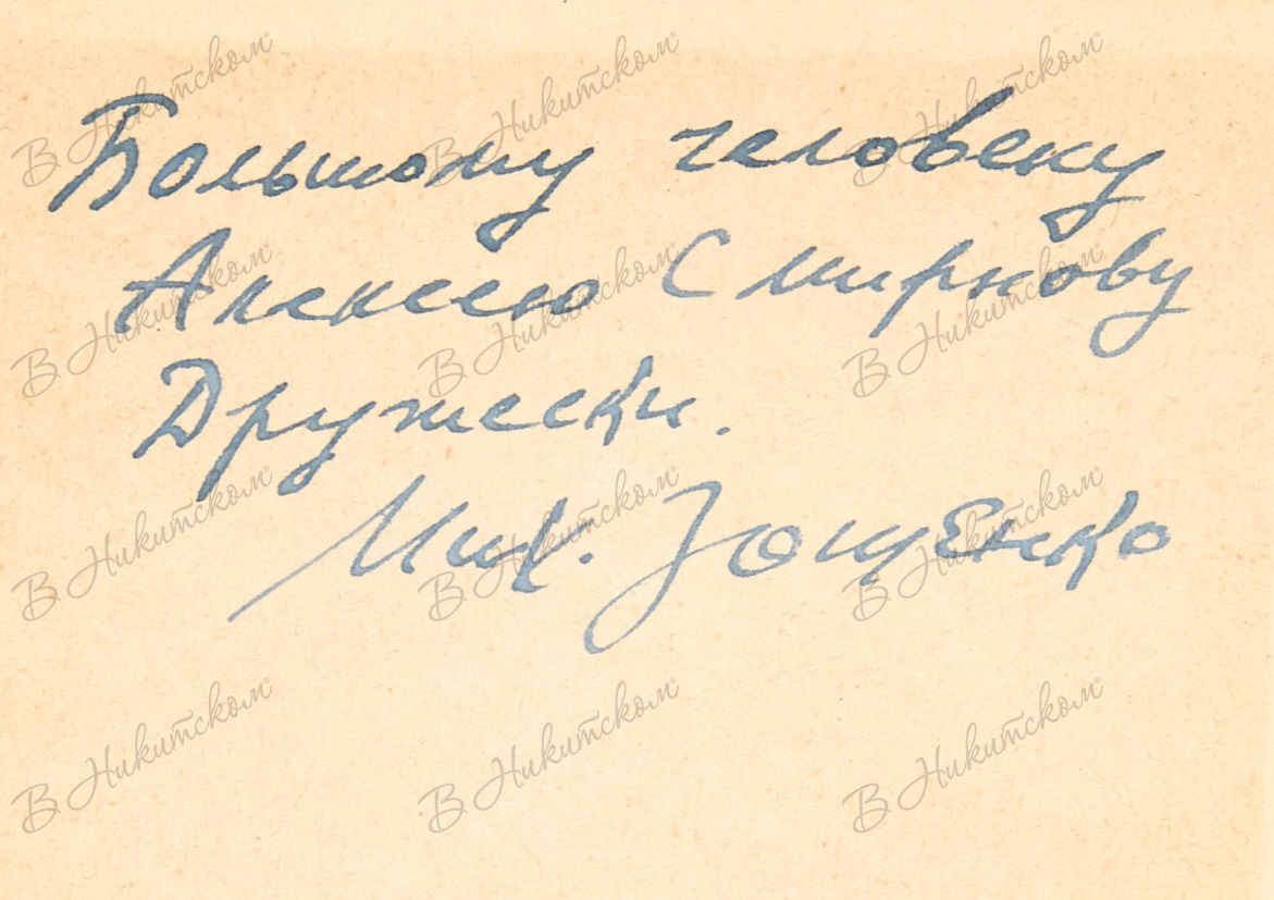 [2] с. 20,7 х 13,5 см. В картонажном издательском переплете, тканевый корешок. Надлом заднего форзаца, корешок отходит от блока. Потертости переплета. На форзаце 2а автограф автора, предположительно адресованный актёру А.М. Смирнову: «Большому человеку / Алексею Смирнову / дружески. Мих. Зощенко».