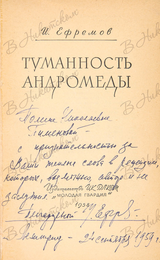 Ефремов, И. [Автограф]. Туманность Андромеды. М.: «Молодая гвардия», 1958.