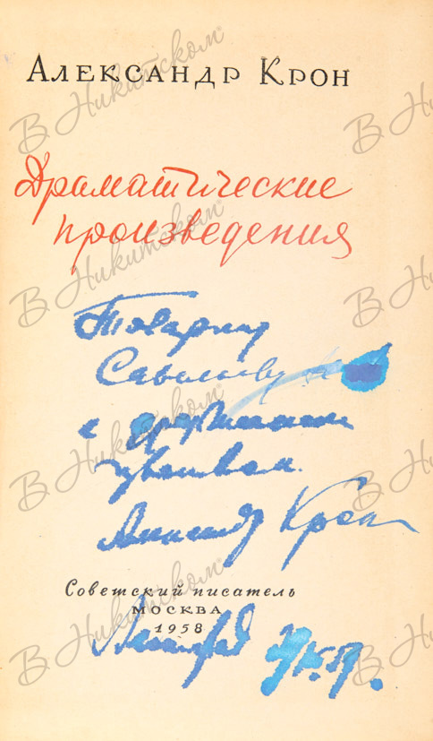 Крон, А. [Автограф]. Драматические произведения. М.: «Советский писатель», 1958.