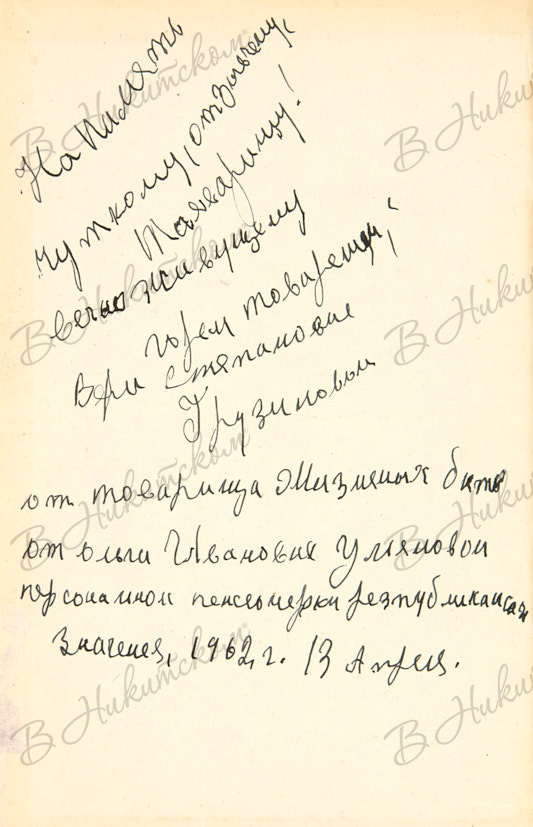 298, [2] с. 20,5 х 14 см. В коленкоровом издательском переплете, ляссе. В очень хорошем состоянии. На форзаце 1а дарственная надпись: «На память / чуткому, отзывчивому / товарищу! / вечно живущему / горем товарища, / Вере Степановне / Грузиновой / от товарища жизненных [нрзб] / от Ольги Ивановны Ульяновой / персональной пенсионерки республиканского / значения, 1962 г. 13 апреля.».