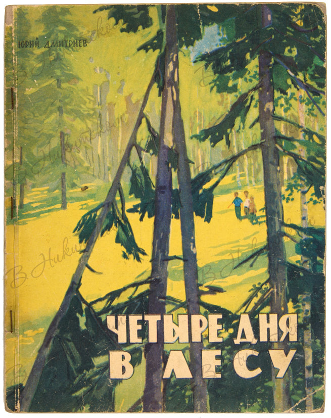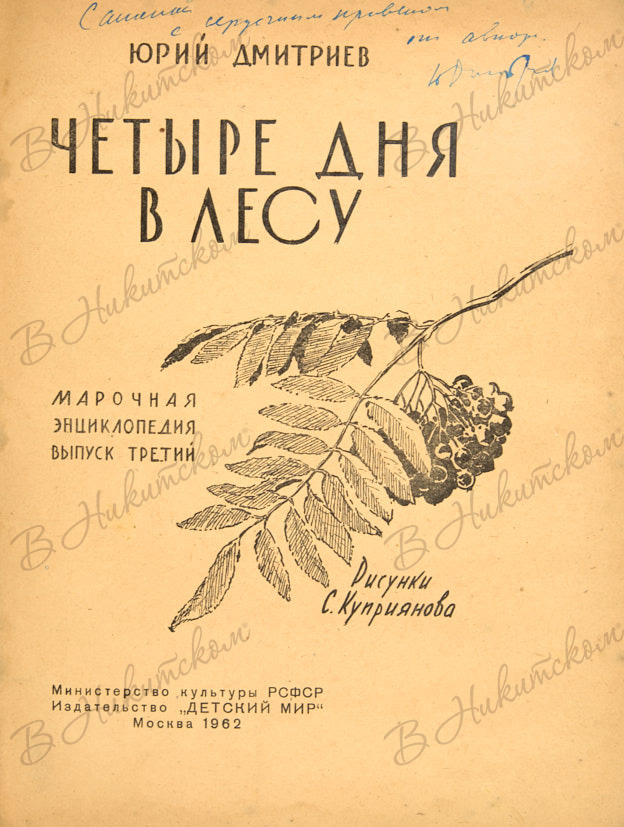 Дмитриев, Ю. [Автограф]. Четыре дня в лесу. Марочная энциклопедия. Выпуск третий / рисунки С. Куприянова. М.: «Детский мир», 1962.