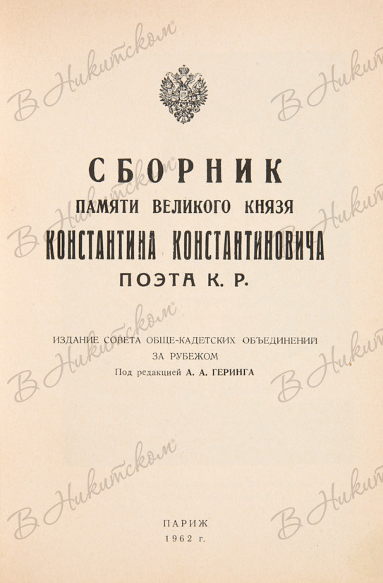 Сборник памяти Великого князя Константина Константиновича. Поэта К.Р. / под ред. А.А. Геринга. Париж, 1962.