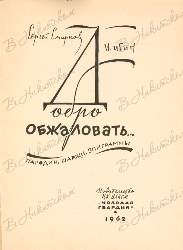 96 с. 22 х 17,5 см. В коленкоровом издательском иллюстрированном переплете. Надломы форзацев. На с. 69 стихотворный ответ М. Светлова на сатиру Смирнова и карикатурный шарж Игина: «Алаверды. / Не пряча в карманах / фиги, / не плача от муторных / снов - Рисует пусть хари Игин / и пишет куплеты Смирнов - / Один будет светел как / месяц - / Хороший поэт Светлов. / М Светлов.».