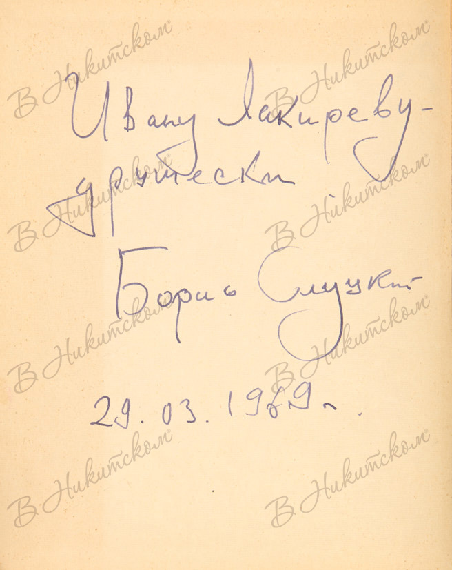 181, [3] с. 16,8 х 13,2 см. В коленкоровом издательском переплете с серебристым и цветным тиснением. В очень хорошем состоянии. На обороте форзаца 2а автограф автора: «Ивану Лакиреву - / дружески! / Борис Слуцкий / 29.03.1969 г.».