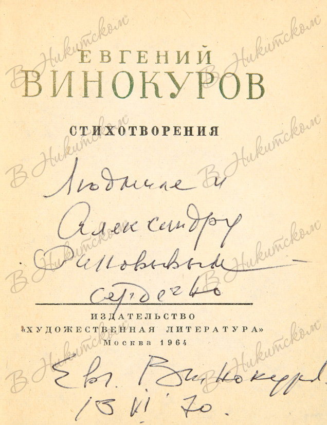 286, [2] с., 1 л. портр. 13,1 х 10,6 см. В коленкоровом издательском переплете с золотым тиснением. Надлом переднего форзаца. На титульном листе автограф автора: «Людмиле и / Александру / Зиновьевым - / сердечно / Евг. Винокуров. / 13 VI 70.».