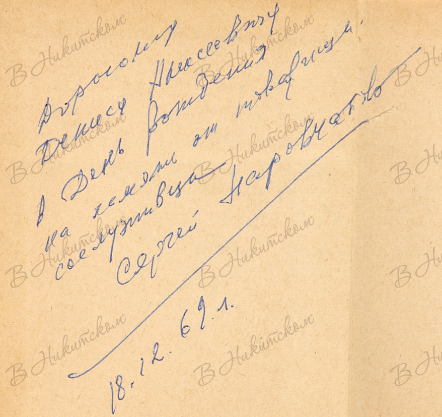 254, [2] с., 1 л. портр. 13 х 10,4 см. В коленкоровом издательском переплете с золотым тиснением. Потертости и загрязнения переплета. Надлом переднего форзаца, титульный лист практически выпадает из блока. Небольшие замятости некоторых страниц в конце блока. На форзаце 1а автограф автора: «Дорогому / Денису Алексеевичу / в День Рождения / на память от товарища - / сослуживца / Сергей Наровчатов / 18.12.69 г.».