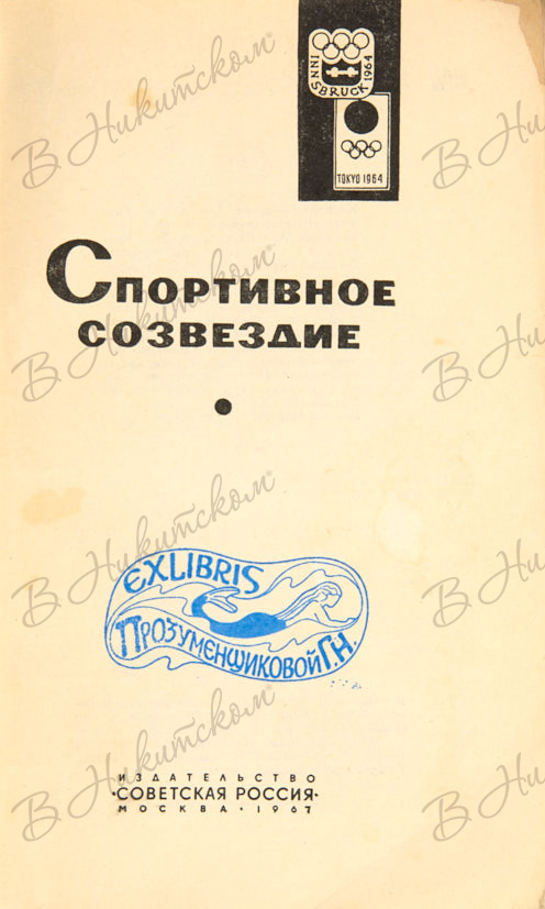 2. Спортивное созвездие. М.: Советская Россия, 1967. 195, [3] с., 8 л. ил. 20 х 13 см. В издательской обложке. Потертости и загрязнения обложки, незначительные пятна в блоке. На титуле штемпельный экслибрис Г.Н. Прозуменщиковой. На передней обложке надпись простым карандашом: «Г. Прозуменщикова» (автограф?).