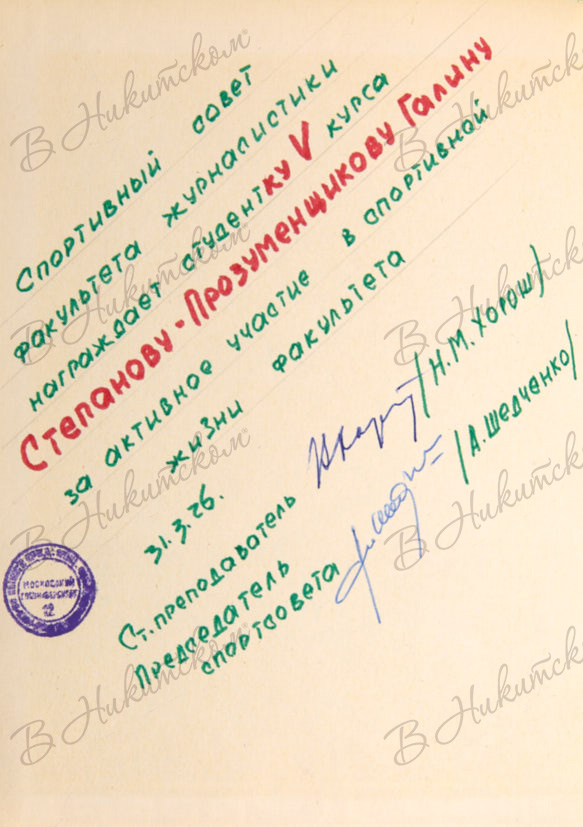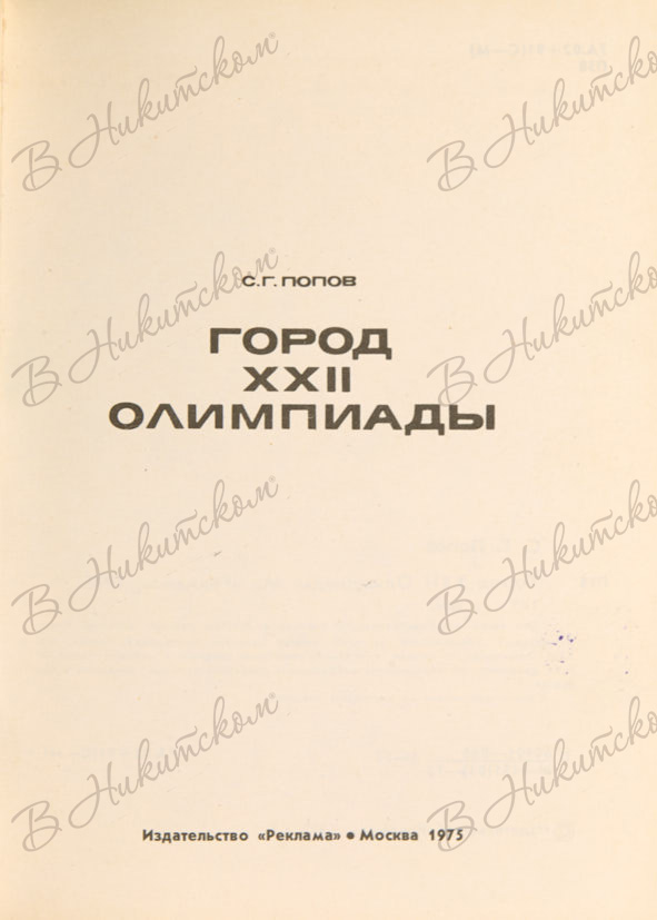 1. Попов, СГ. Город XXII олимпиады. М.: Реклама. 1975. 117, [10] с., ил. 17 х 13,3 см. В издательском переплете. На обороте форзаца 1б наградная дарственная надпись, адресованная Г. Степановой-Прозуменщиковой: «Спортивный совет факультета журналистики награждает студентку V курса Степанову-Прозуменнщикову Галину за активное участие в спортивной жизни факультета».