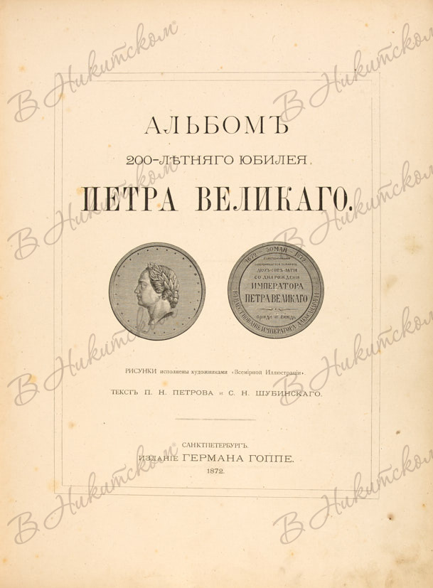 Альбом 200-летнего юбилея Петра Великого / рис. исполнены художниками «Всемирной иллюстрации», текст П.Н. Петрова и С.Н. Шубинского. СПб.: Издание Германа Гоппе, 1872.