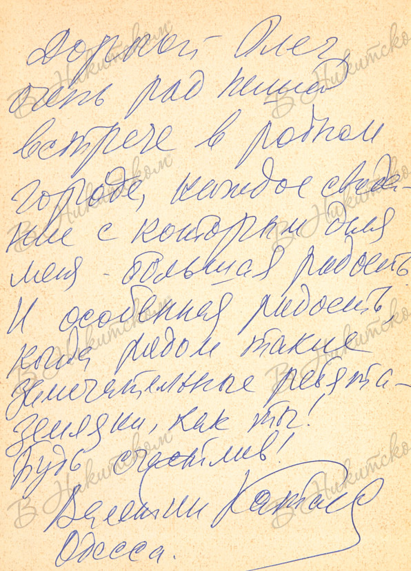 78, [2] с., ил. 22,2 х 17,4 см. В картонажном издательском иллюстрированном переплете, тканевый корешок. Потертости крышек и корешка. На обороте форзаца 2а: «Дорогой Олег, / очень рад нашей / встрече в родном / городе, каждое свида-/ ние с которым для / меня - большая радость, / и особенная радость, / когда рядом такие / замечательные ребята- / земляки, как ты! / Будь счастлив! / Валентин Катаев / Одесса.».