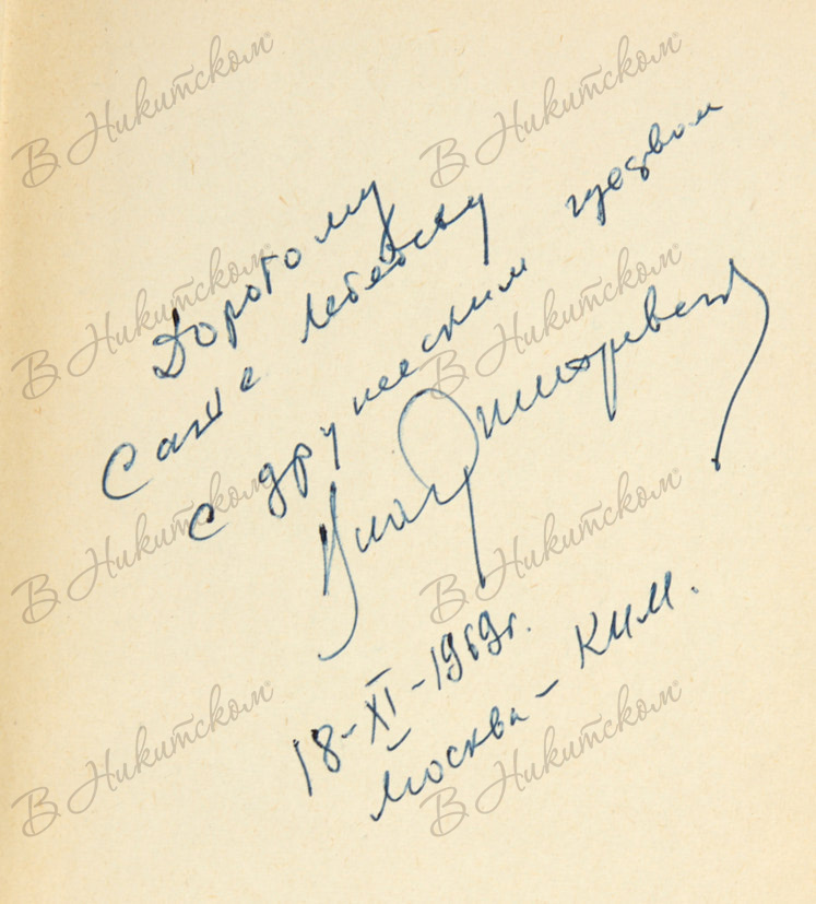 335, [1] с., ил. 20,6 х 13,3 см. В картонажном издательском иллюстрированном переплете, тканевый корешок. На форзаце 2а автограф автора: «Дорогому / Саше Лебедеву / с дружеским приветом / ВлДмитревский / 19-XI-1969 г. / Москва - Ким.».