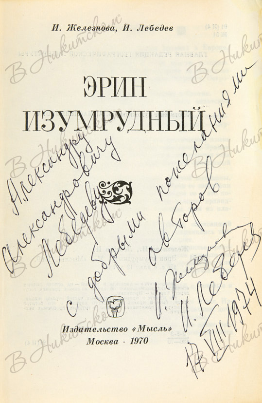 [Автографы авторов]. Железнова, И. Лебедев, И. Эрин изумрудный. М.: Издательство «Мысль», 1970.