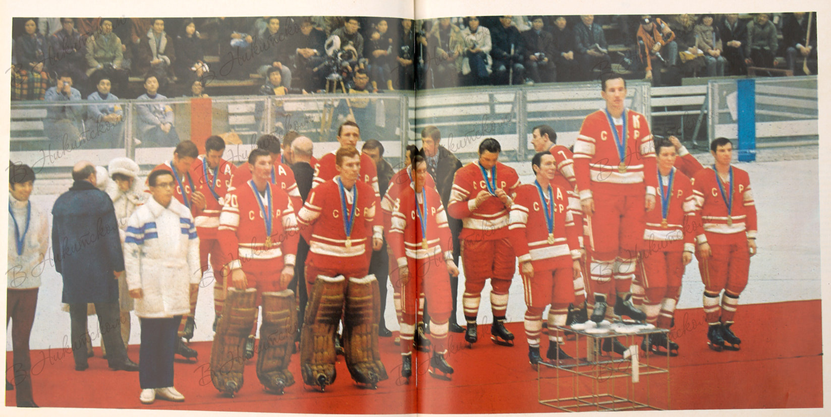 256 с., ил. 23 х 23 см. В иллюстрированном издательском ламинированном переплете. Потертости, незначительные загрязнения переплета. Надрывы корешка. Издание на двух языках: русском и английском. На с. 3 дарственная хоккеиста В. Харламова: «Славке на память / Харламов».