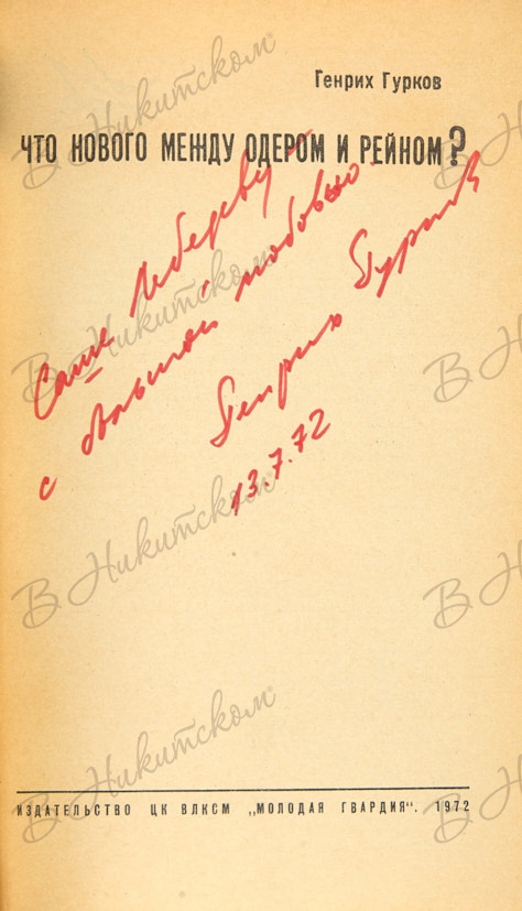 Гурков, Г. [Автограф]. Что нового между Одером и Рейном. М.: «Молодая гвардия», 1972.
