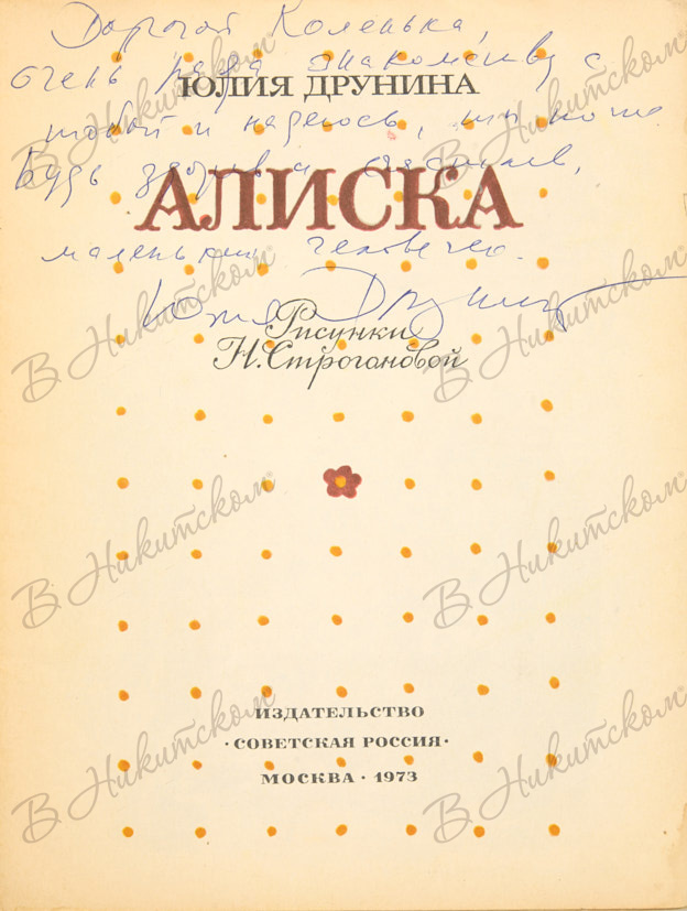 Друнина, Ю. [Автограф]. Алиска / рис. Н. Строгановой. М.: Издательство «Советская Россия», 1973.