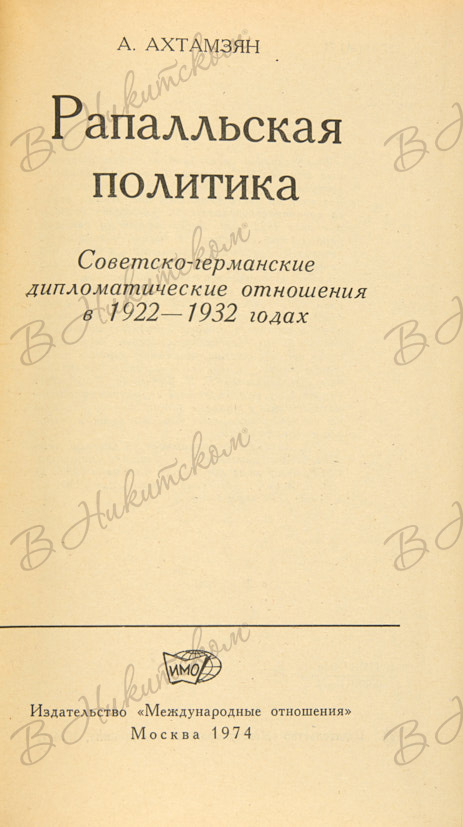 Ахтамзян, А. [Автограф]. Рапалльская политика. М.: «Международные отношения», 1974.
