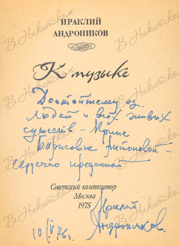 Андроников, И. [Автограф]. К музыке. М.: «Советский композитор», 1975.