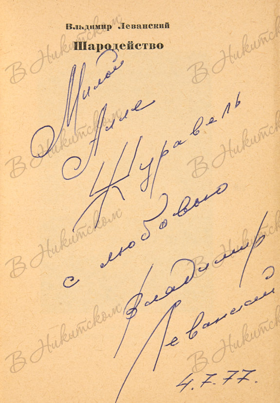 1 л. фронт., 86, [2] с. 14,1 х 11 см. В иллюстрированной издательской обложке. В очень хорошем состоянии. На обороте фронтисписа автограф автора: «Милой / Алле / Журавель / с любовью / Владимир / Леванский / 4.7.77.».