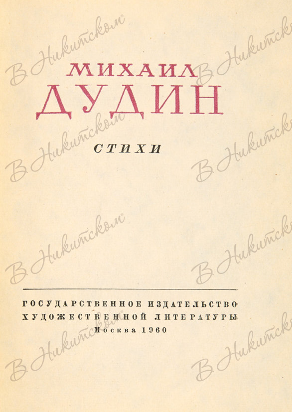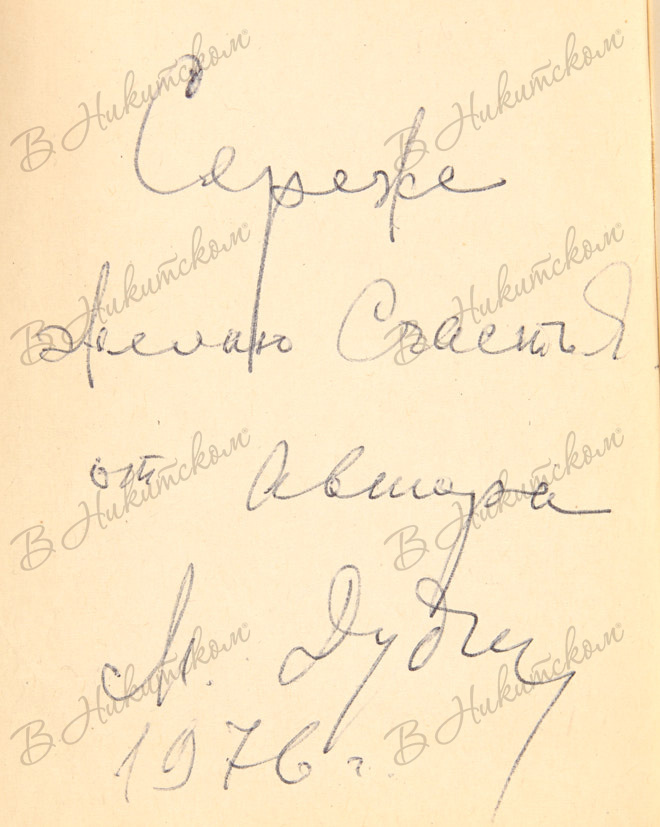 190, [2] с., 1 л. портр. 13,2 х 10,5 см. В коленкоровом издательском переплете с золотым тиснением. Потертости, незначительные загрязнения переплета. На обороте форзаца 2а автограф автора: «Сереже / желаю счастья / от автора / М. Дудин / 1976 г.». Тираж 10000 экз.