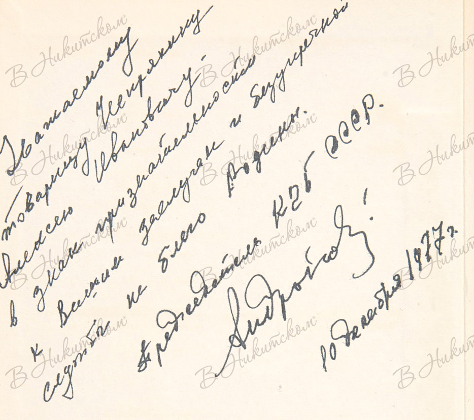 382, [2] с., ил. 20,8 х 13,5 см. В картонажном издательском иллюстрированном переплете, тканевый корешок. Небольшие потертости переплета и корешка. На форзаце 1а дарственная надпись: «Уважаемому / товарищу Непряхину / Алексею Ивановичу - / в знак признательности / к вашим заслугам и безупречной / службы на благо Родины. / Председатель КГБ СССР / Андропов / 10 декабря 1977 г.».