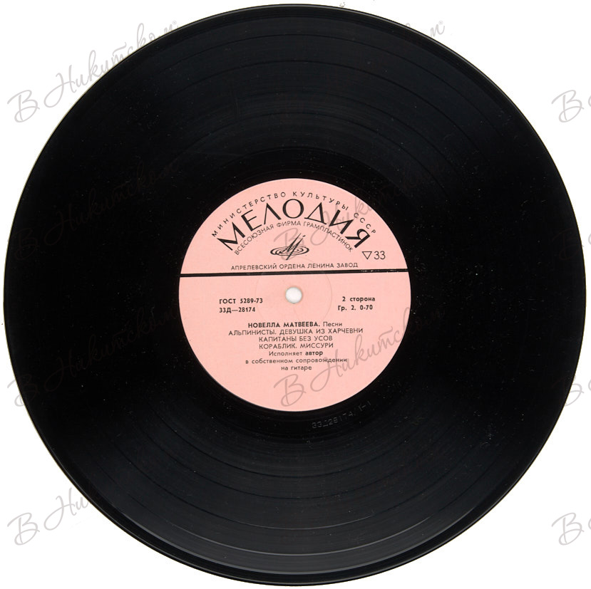 Пластинка в конверте. Размер конверта: 26 х 26 см. На задней сторонке конверта дарственная надпись: «Милой / Надежде Дементьевой / от исполнителя / Н. Матвеева. / 23 марта 1980 г.».