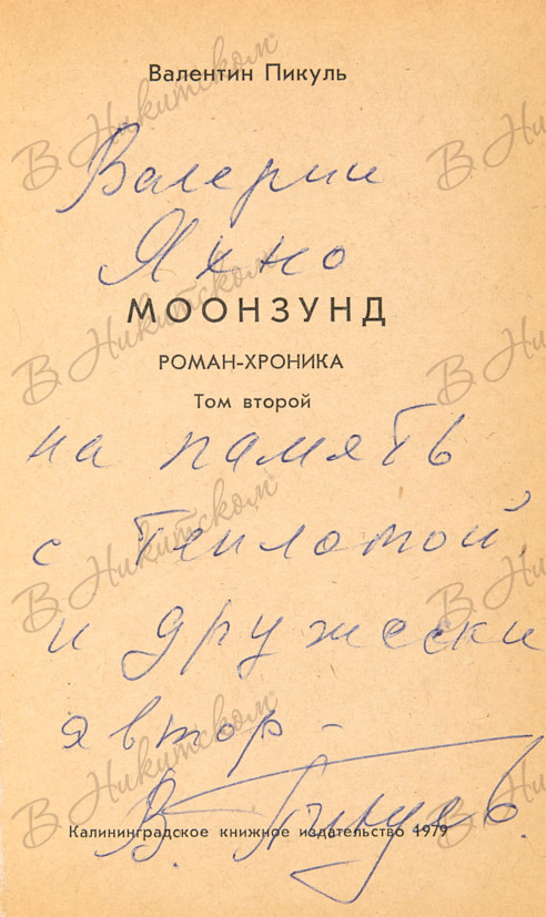 Пикуль, В. [Автограф]. Моонзунд. Роман-хроника. Том второй. Калининград: Калининградское книжное издательство, 1979.