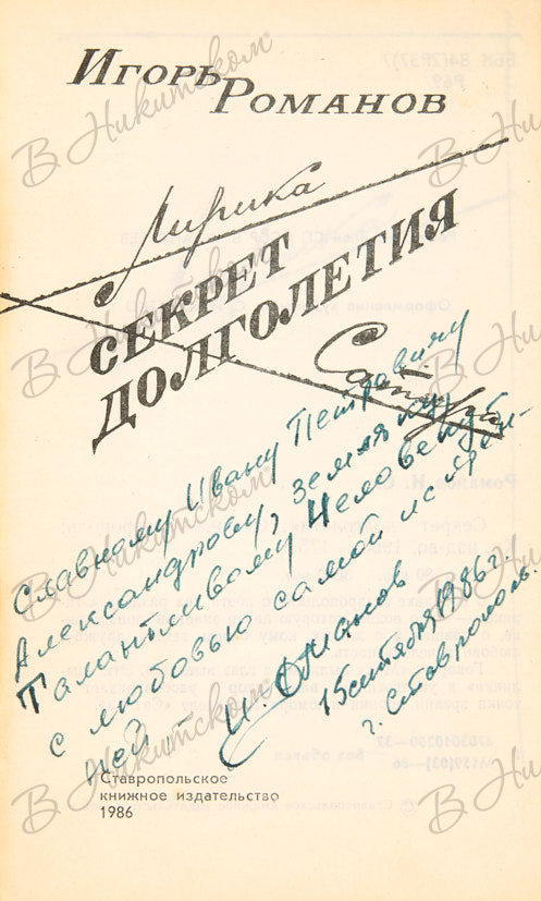 Романов, И. [Автограф]. Лирика. Секрет долголетия. Ставрополь: Ставропольское книжное издательство, 1986.